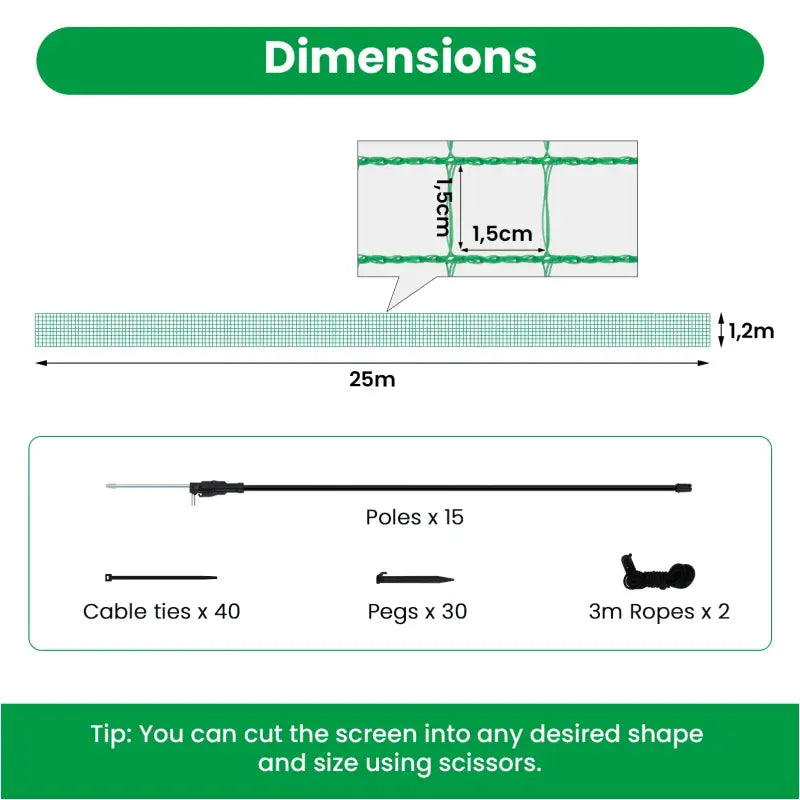 Dit veelzijdige hekwerk is niet alleen ideaal als tuin- of campinghek, maar kan ook worden gebruikt om verschillende gebieden op boerderijen, boomgaarden of bouwplaatsen af te zetten. Het is gemakkelijk te installeren dankzij de meegeleverde 15 glasvezel palen met metalen punten, die eenvoudig in de grond kunnen worden gestoken. Daarnaast zorgen de twee liertouwen, 30 pennen en 40 kabelbinders voor extra stabiliteit en duurzaamheid van het hek. Wanneer het hek niet wordt gebruikt, kan het eenvoudig worden opgerold voor handige opslag, waardoor het een praktische en gebruiksvriendelijke keuze is voor uw tuinbehoeften.