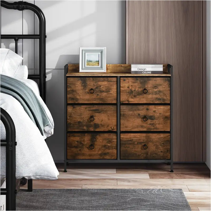 BukkitBow - Ladekast met 6 Stoffen Lades - Met Opslagplank van Hout/Metaal/Non-woven Stof - 80x29x78 cm - Rustiek Bruin/Zwart