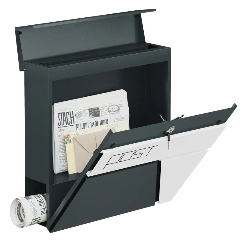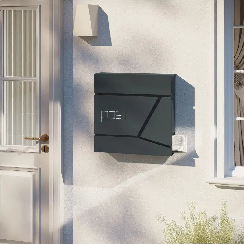 De BukkitBow Wandbrievenbus met Krantenhouder combineert een strak, modern design met praktische functionaliteit, waardoor hij een stijlvolle aanvulling is op elke gevel. Gemaakt van hoogwaardig verzinkt staal en afgewerkt in een elegante antracietkleur, biedt deze brievenbus niet alleen een veilige plek voor je post, maar voegt hij ook een esthetisch element toe aan je huis. De strakke lijnen en geometrische vormen van deze brievenbus geven een moderne uitstraling, waardoor hij perfect past bij een eigentijdse of minimalistische inrichting. Met afmetingen van 37 x 37 x 10,5 cm is er voldoende ruimte voor zowel brieven als kleine pakketten, terwijl de geïntegreerde krantenhouder zorgt voor een handige opslagplaats voor je dagbladen en folders.