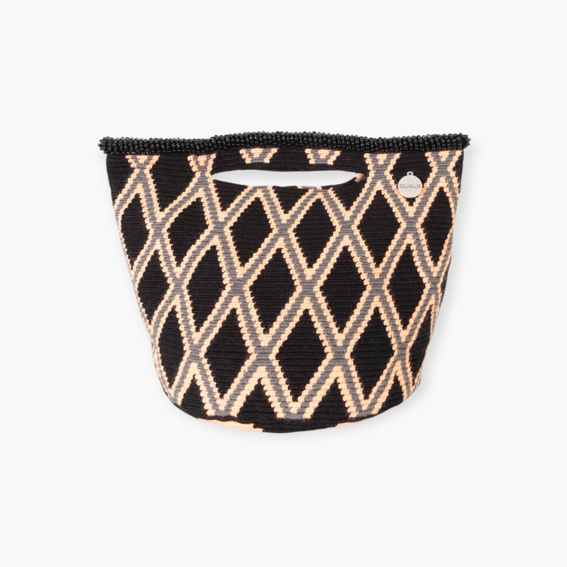 Artfully crafted by hand using a single thread weave. With a sleek cutout handle and complemented by recycled beads, this geometric top-handle bag is ready to charm.