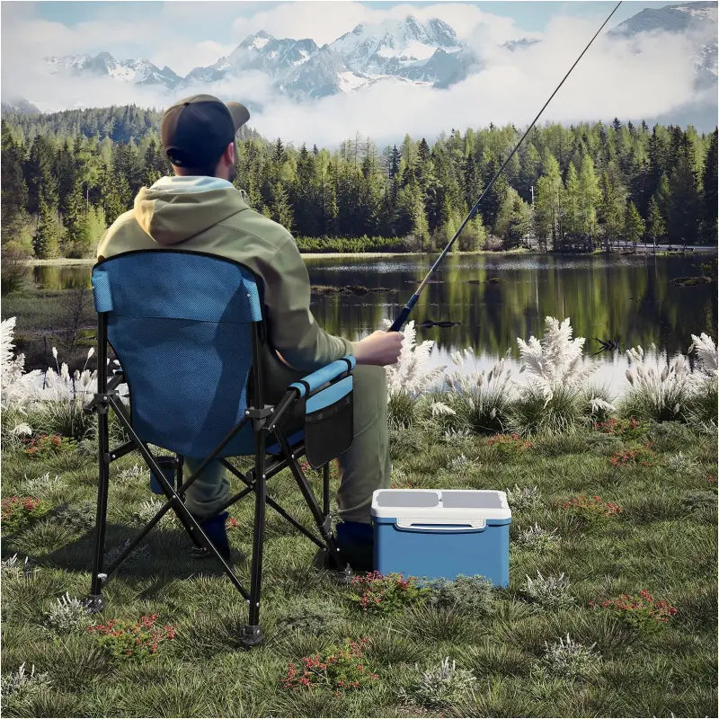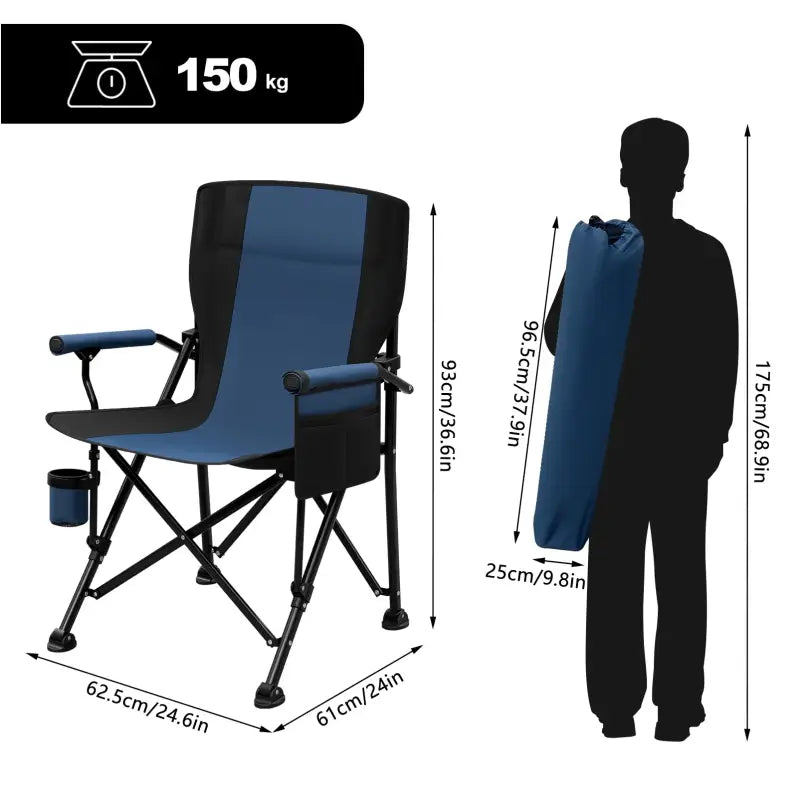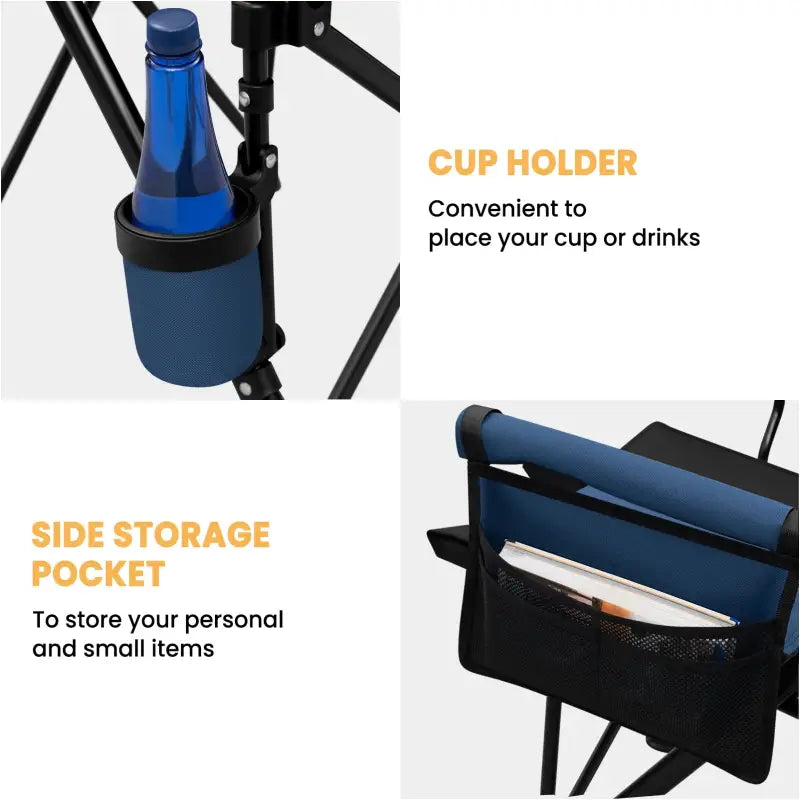 Naast de robuuste constructie biedt de stoel ook uitzonderlijk zitcomfort. De zitting van 51 x 46 cm, voorzien van een hoofdsteun en gewatteerde armleuningen, zorgt voor comfortabel zitten tijdens langere perioden. Bovendien is de stoel uitgerust met een bekerhouder en een zijzak, handig voor het opbergen van uw drankje, zonnebril, boeken of snacks. Alles binnen handbereik voor optimaal genot van uw vrije tijd.