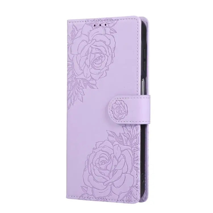 Voor Samsung Galaxy S25 FE 5G Rozenbloem Reliëf Leren Telefoonhoesje met 3 Kaartsleuven (Paars)