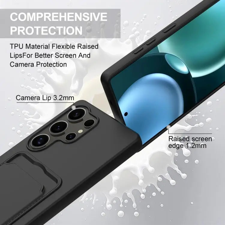 Voor Samsung Galaxy S25 Ultra 5G Geïntegreerde Kaarthouder Effen Kleur Vloeibare Siliconen Telefoonhoes Gen2 met Korte Lanyard (Zwart)