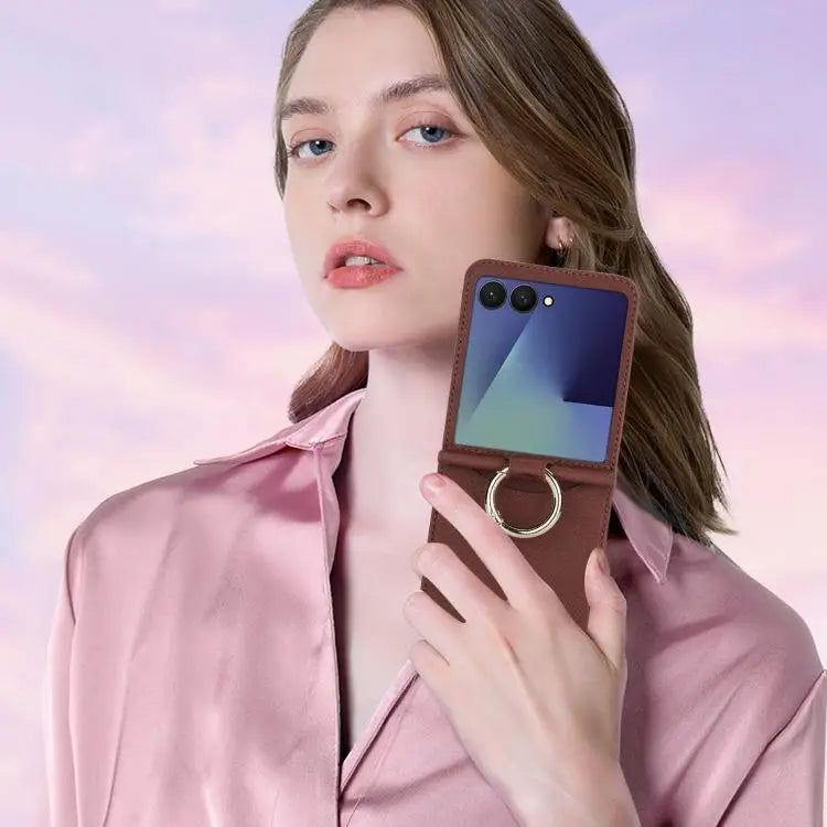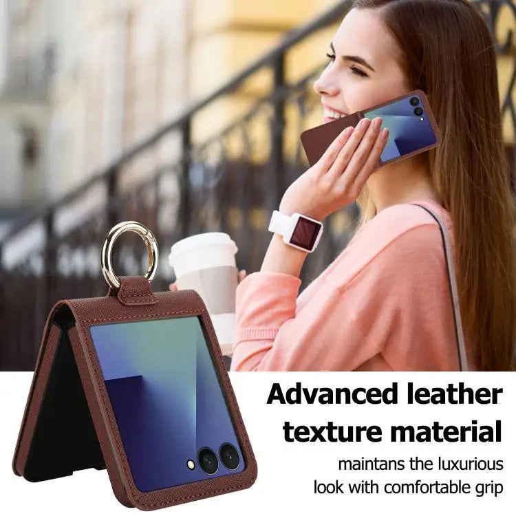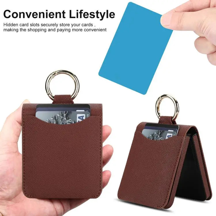 Voor Samsung Galaxy Z Flip7 5G Cross Texture Ring Design Kaartsleuf Leren Telefoonhoesje (Bruin)