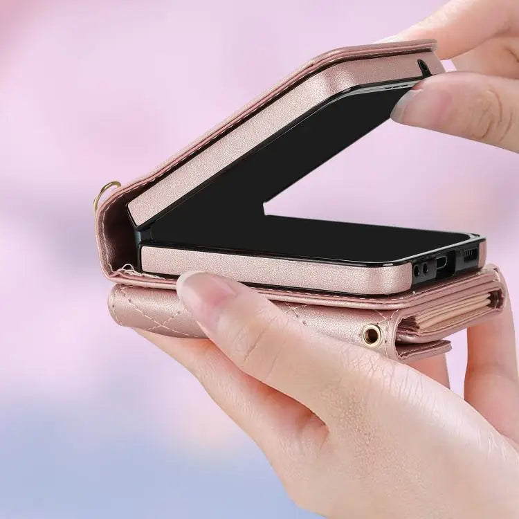 Voor Samsung Galaxy Z Flip7 5G Rhombic Texture Card Bag PU-telefoonhoesje met lange lanyard (roségoud)