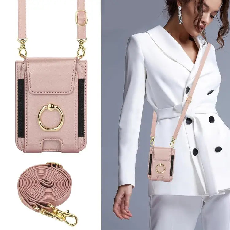 Voor Samsung Galaxy Z Flip7 5G Ringhouder Portemonnee Kaarthouder Leren Telefoonhoesje (Roségoud)