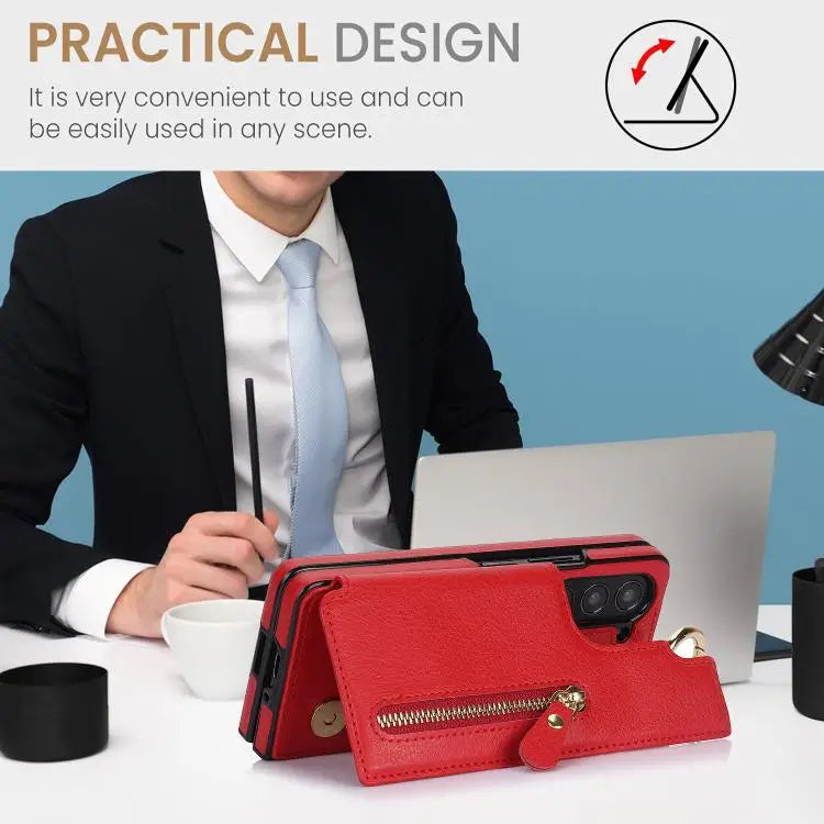 Voor Samsung Galaxy Z Fold7 Litchi Texture Ring Rits Dubbele Gesp Leren Telefoonhoesje (Rood)