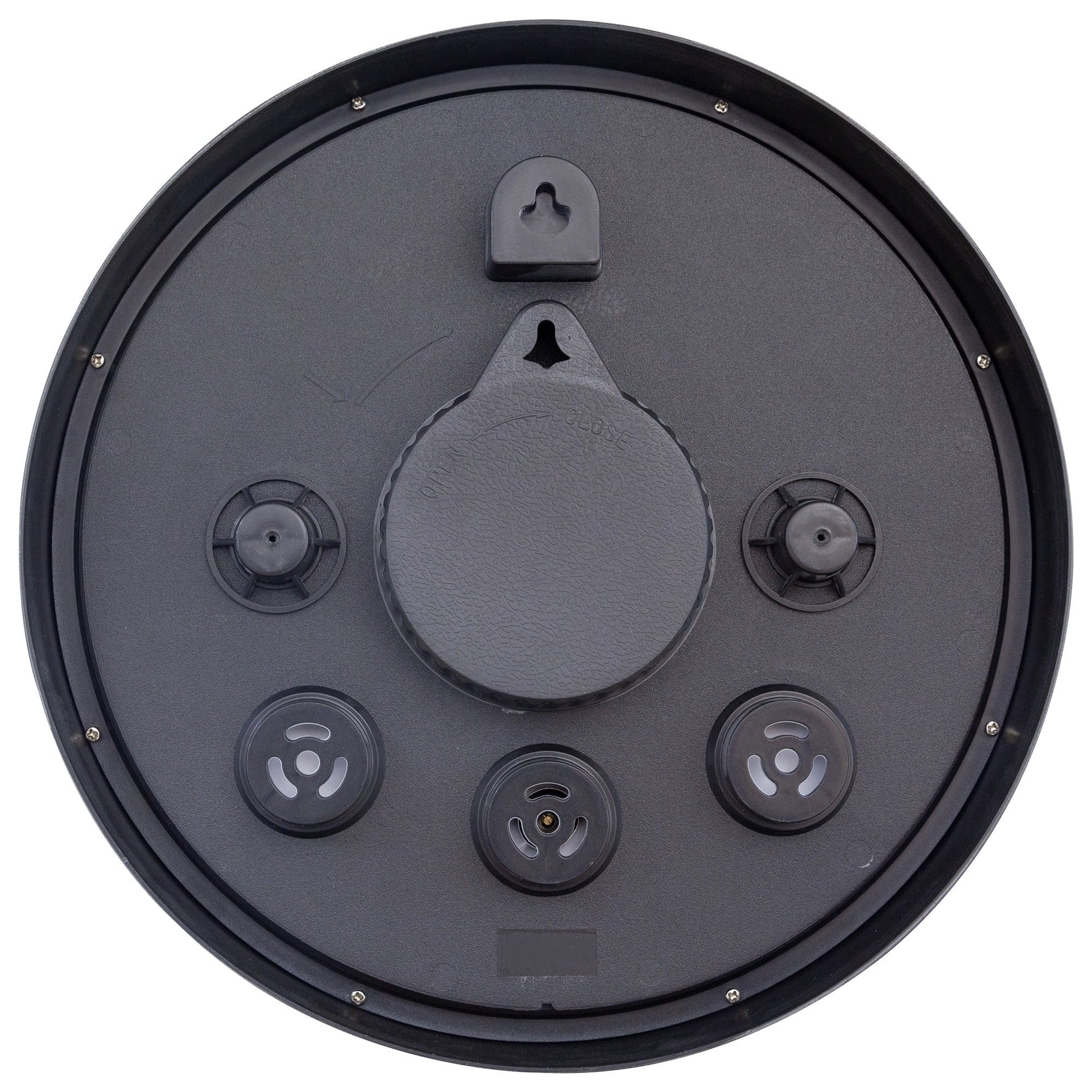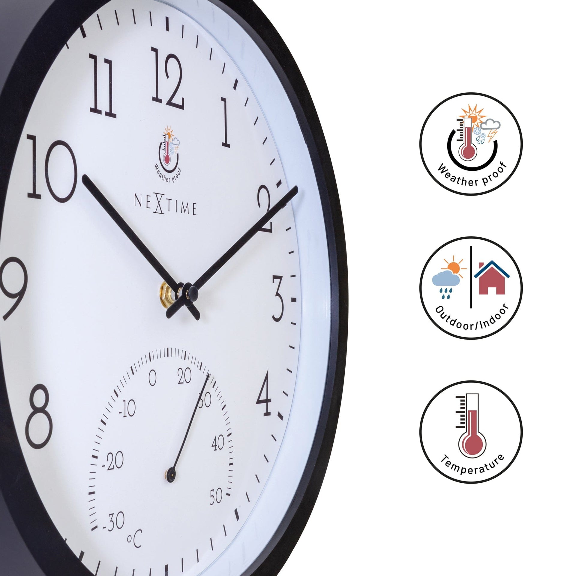 De NeXtime Marigold (30,5 cm) wandklok geeft naast de tijd ook de huidige temperatuur in Celsius weer. De klok heeft een minimalistisch design met een zwarte kast, een witte wijzerplaat met een duidelijke zwarte cijfer-/streepindex en zwarte wijzers. De klok past perfect in elke kamer, keuken, binnen of buiten, zoals tuin of balkon. Deze klok is weerbestendig en werkt op 1 AA-batterij (niet inbegrepen).