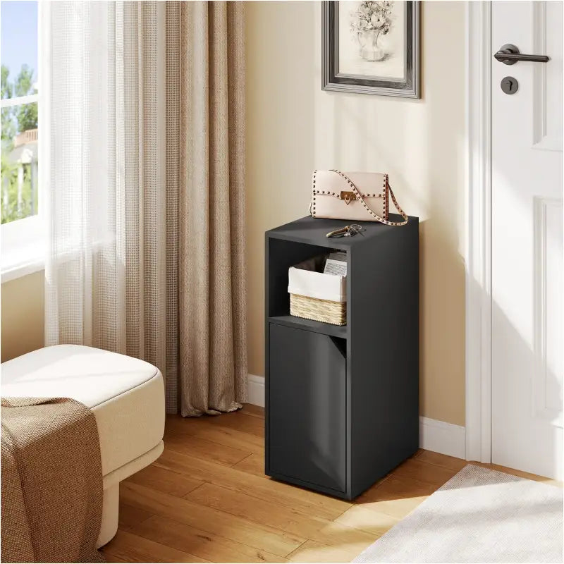 Dit nachtkastje biedt ruime opbergmogelijkheden met zowel open als gesloten compartimenten. Het bovenblad is ideaal voor het plaatsen van een lamp, wekker, of uw favoriete boek. De open ruimte eronder biedt snelle toegang tot items zoals afstandsbedieningen, tijdschriften of andere alledaagse benodigdheden. Voor items die u liever uit het zicht bewaart, is er een afsluitbaar vak met een verstelbare plank. Hiermee kunt u eenvoudig de hoogte aanpassen van objecten van verschillende formaten op te bergen, zoals documenten, medicijnen of persoonlijke eigendommen. Deze slanke indeling maakt het nachtkastje niet alleen geschikt voor de slaapkamer, maar ook als bijzettafel in de woonkamer of hal.