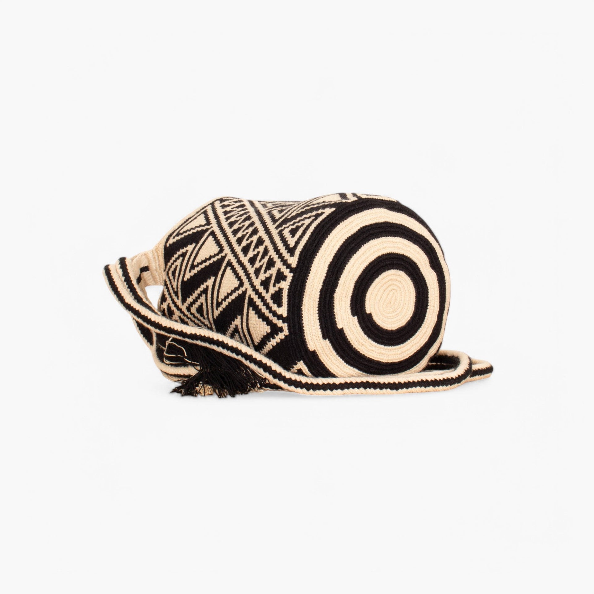 Geometrik omuz çantası , nesiller boyunca aktarılan teknikler kullanılarak Wayuu zanaatkarları tarafından tamamen elle üretilmiştir.